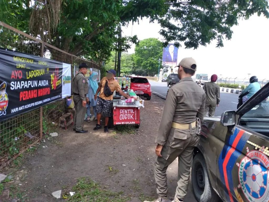 Kemudian petugas melakukan peneguran aktifitas berjualan pedagang kaki lima (PKL) yang ada di sekitaran taman patung bandara yang dikawasan itu harus bersih dari PKL.